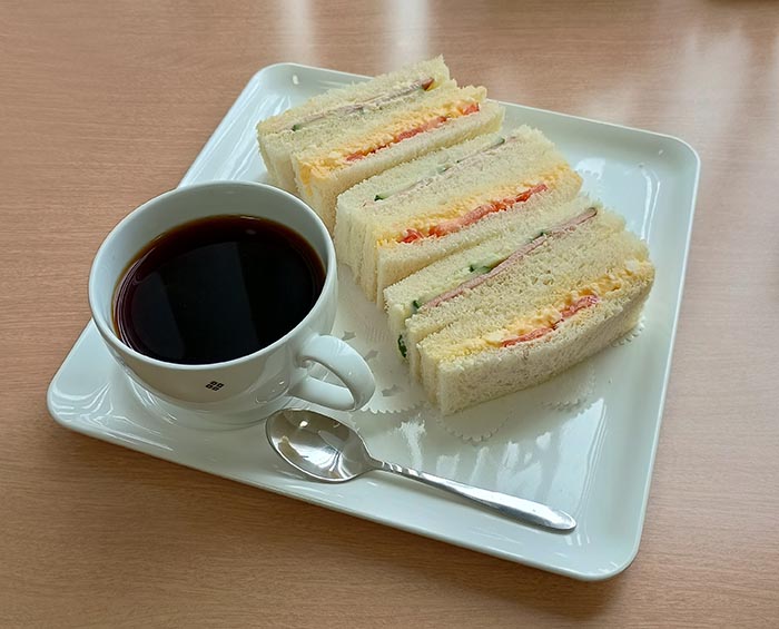 今日は割引クーポンがもらえたので上階の食堂でサンドイッチセットを。