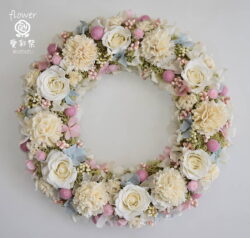 白いバラにピンクと水色のお花で 優しい色合いのプリザーブドフラワーリース(22cm)