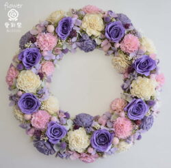 紫色のバラ 白・ピンク・紫のお花 落ち着いた色合いのプリザーブドフラワーリース 誕生日(27cm)